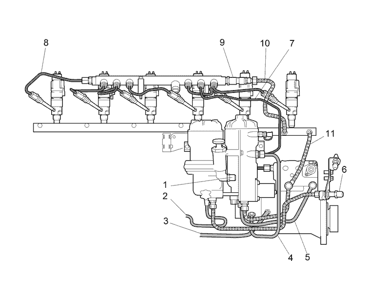 Топливоподкачивающий насос забирает топливо из бака. Топливо поступает в соединение 1 и прокачивается через всасывающий фильтр. Из всасывающего фильтра топливо поступает в охладитель блока управления через топливный трубопровод 2, а затем из охладителя блока управления подается в подкачивающий насос через топливный трубопровод 3. Подкачивающий насос поднимает давление топлива до примерно 9-12 бар и подает топливо через напорный фильтр и топливопровод 4. От напорного фильтра топливо подается через топливопровод 5 к впускному клапану дозирования топлива, установленному на топливном насосе высокого давления. Впускной клапан дозирования топлива регулирует количество топлива, подаваемого в топливный насос высокого давления, при поступлении соответствующего запроса от блока управления двигателем. Насос высокого давления нагнетает давление до максимального значения 3000 бар. Топливо поступает в накопитель через трубопровод высокого давления 7. Трубопровод высокого давления 8 проходит от накопителей к соединительным штуцерам, благодаря чему обеспечена подача топлива к форсункам. Когда на электромагнитный клапан в форсунке подается питание, форсунка открывается, и топливо впрыскивается в цилиндр. Топливная система работает под высоким давлением и поэтому важно, чтобы в топливе на стороне высокого давления не было воды. Вода вызывает коррозию и повреждение элементов топливной системы, и из-за жестких допусков в системе происходит повреждение элементов. Чтобы исключить присутствие воды в топливной системе на стороне высокого давления, вода отделяется во всасывающем фильтре и возвращается в топливный бак по трубопроводу 6. На накопителе предусмотрен предохранительный клапан 9, который открывается, если возникает неисправность в топливной системе, приводящая к чрезмерно высокому давлению топлива. Предохранительный клапан открывается при давлении 3 000 бар и понижает давление топлива до 1 000 бар, а затем регулирует давление топлива в диапазоне 1 000 ± 300 бар. Когда предохранительный клапан открывается, топливо возвращается через трубопровод 10. Топливо, отбираемое через предохранительный клапан, нагревает трубопровод, расположенный после предохранительного клапана. Излишек топлива от форсунок возвращается из топливной рампы в топливный бак через трубопровод 11.